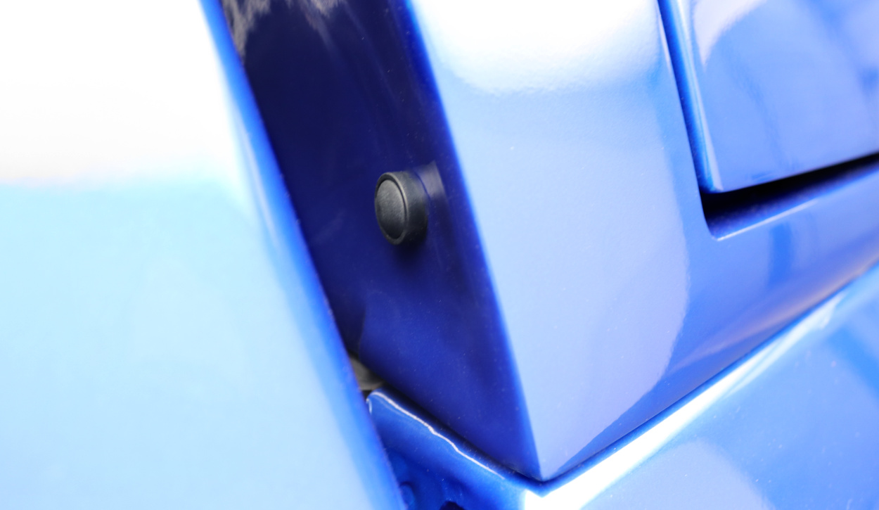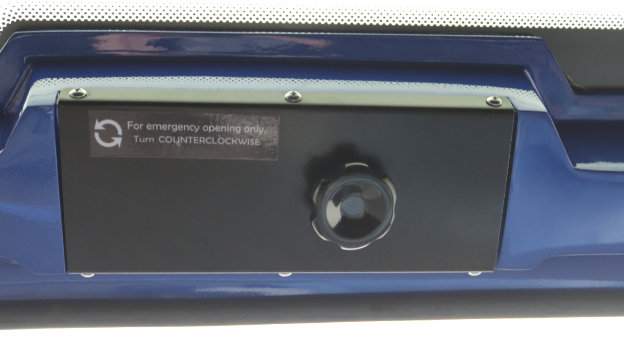 - Grands volets latéraux avec ouverture par bouton électronique. Le bouton se trouve à l'avant du hardtop.